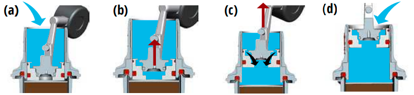 (a) Începeți cu maneta coborâtă și umpleți cilindrul de infuzare până la margine cu apă. (b) Ridicați maneta suficient pentru a detașa tija și a deschide supapa, permițând apei să umple spațiul de deasupra (Mișcați maneta pentru a minimiza bulele de aer). (c) Continuați să ridicați încet maneta, iar apa va trece prin supapă și în camera de infuzare. (d) Umpleți camera prin deschiderea făcută între tijă și piston odată ce maneta este complet ridicată.